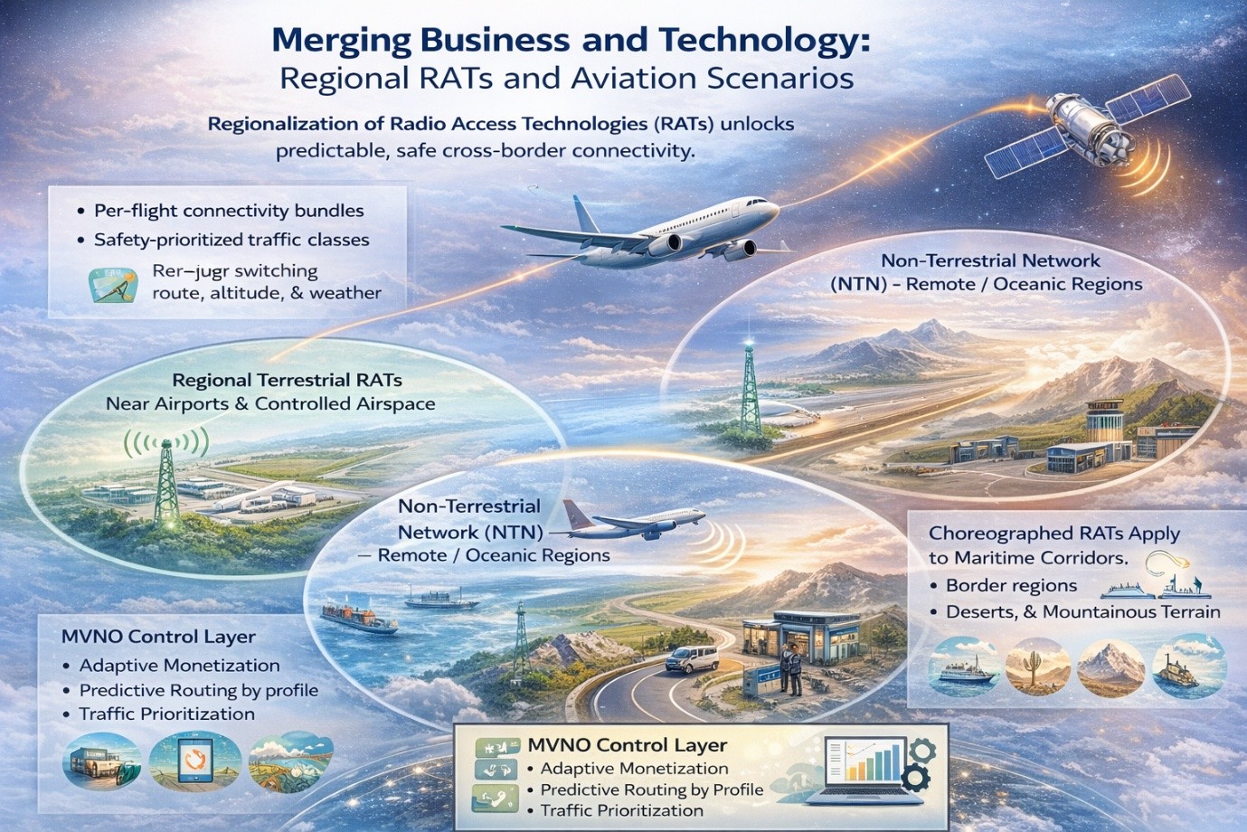 Here, NTN becomes the primary access, while regional terrestrial RATs take over near airports and controlled airspace. For MVNOs, this unlocks regional service constructs: