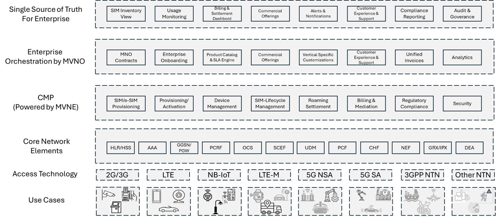 - By leveraging the MVNE’s CMP technical capabilities, MVNOs tailor the products and services into market-ready offerings, including flexible pricing models, defined SLAs, and vertical-specific bundles aligned to enterprise requirements.